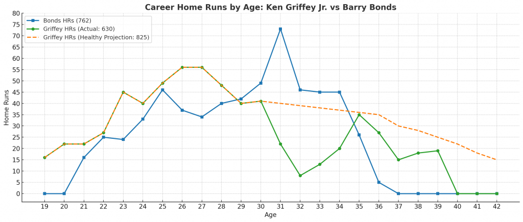 Had he stayed healthy through his thirties, Griffey could have produced numbers that would stand untouched even today. From ages 31 to 42, a healthy Griffey could have averaged between 35 and 40 home runs annually for at least another six seasons. That is not a reach, it is based on what he had already proven he could do. By that pace, he would have soared past 850 career home runs and easily eclipsed 3,000 hits. His career WAR would have pushed past the century mark, placing him alongside only the most elite in baseball history.
